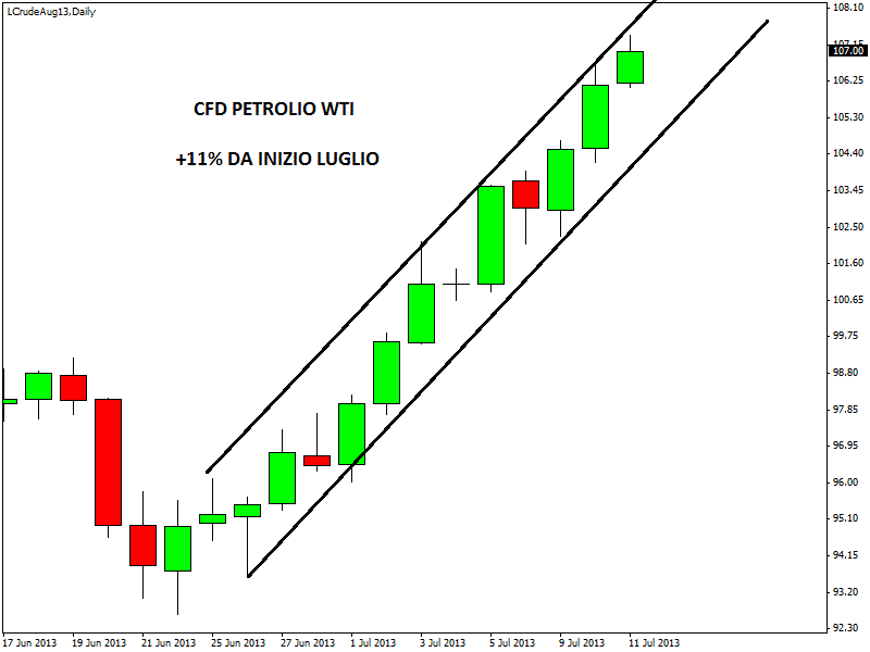 La politica monetaria della Federal Reserve resterà, quindi, ancora molto accomodante con i tassi vicini allo zero per molto tempo. La minute della FED ha messo al tappeto il dollaro americano e favorito l’apprezzamento delle commodity. In forte rialzo c’è soprattutto il prezzo del petrolio americano, che continua a ridurre lo spread con il petrolio Brent. Da inizio luglio il greggio americano ha già messo a segno una performance positiva dell’11% circa, passando da area 96,5 dollari a 107,4 dollari al barile.