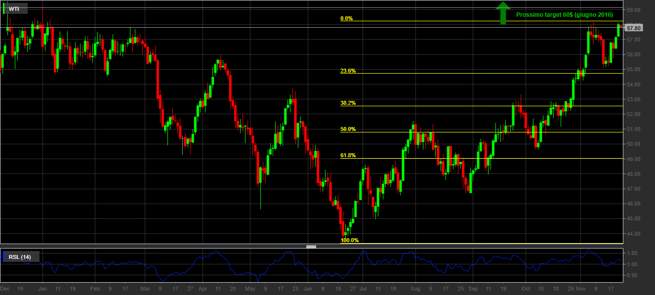 Il prezzo del petrolio è in un trend crescente dallo scorso giugno, quando toccò quota 43$ al barile. Il picco massimo del trend è stato raggiunto l’8 novembre a quota 58,18$, valore sfiorato proprio ieri 22 novembre (58,14$). La quotazione aveva però subito una contrazione fino a poco sopra 55$ al barile (14 novembre), per poi tornare sui livelli precedenti.