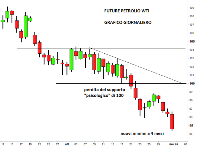 Momento difficile per il mercato del petrolio, che da qualche settimana sta sperimentando una costante discesa delle quotazioni. Venerdì al Nymex il future sul petrolio Wti ha chiuso la seduta con una flessione dell’1,84% a 94,61 dollari al barile, scendendo sui livelli più bassi da oltre 4 mesi a 94,36 dollari. Stanotte sui mercati asiatici, complice l’assenza delle contrattazioni sui mercati di Tokyo e Singapore, chiusi per festività, il greggio americano si è mosso poco ed è rimasto sotto i 95 dollari al barile, confermando un’area di minimo a 94,30 dollari. Negli ultimi due mesi il petrolio americano ha perso più del 13% del proprio valore, ampliando lo spread rispetto alla quotazione del petrolio Brent.