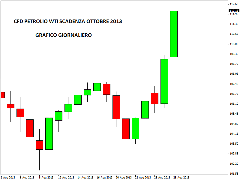 Gli investitori temono che un intervento armato in Siria possa provocare un effetto domino in tutta la regione del Medio Oriente, coinvolgendo nel conflitto anche altri paesi come l’Iran e Israele. Non bisogna dimenticare che dal Middle East arriva circa un terzo del greggio mondiale. Stanotte il petrolio Wti ha superato quota 112 dollari al barile, salendo sui livelli più alti da oltre due anni. Ieri il future sul greggio americano aveva chiuso con un progresso del 3% circa a 109,01 dollari.