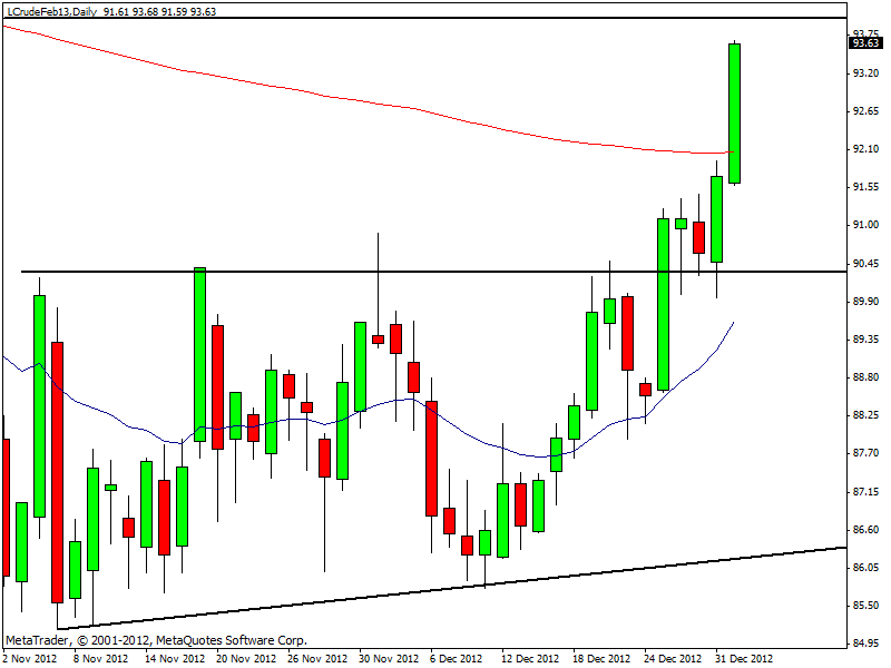 L’accordo sul fiscal cliff negli Stati Uniti ha messo in moto diversi meccanismi di correlazione sui mercati finanziari. L’appetito per il rischio sta spingendo gli investitori a comprare gli asset più rischiosi, tra cui azioni, bond ad alto rendimento e commodity. Il clima di euforia sta favorendo anche il petrolio Wti, che è salito fino a toccare un massimo di giornata a 93,77 dollari al barile.