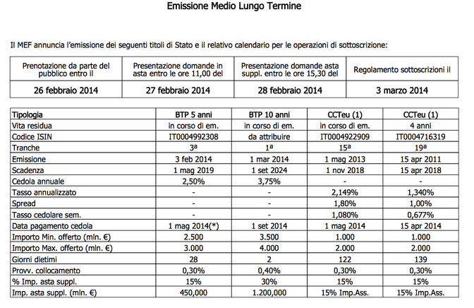 Lo spread è stabile a 193 punti e fa ben sperare nel collocamento di oggi. Queste le informazione del Mef sull’asta a medio-lungo termine: