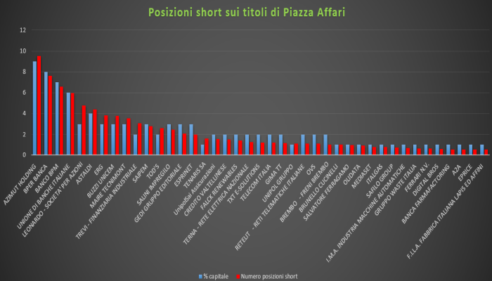 Come vediamo nella seconda tabella, rispetto a due settimane fa è aumentata l’esposizione short su Azimut, passata da un 9,29% all’attuale 9,55%; ora sono 9 le posizioni corte aperte rispetto alle precedenti 8.