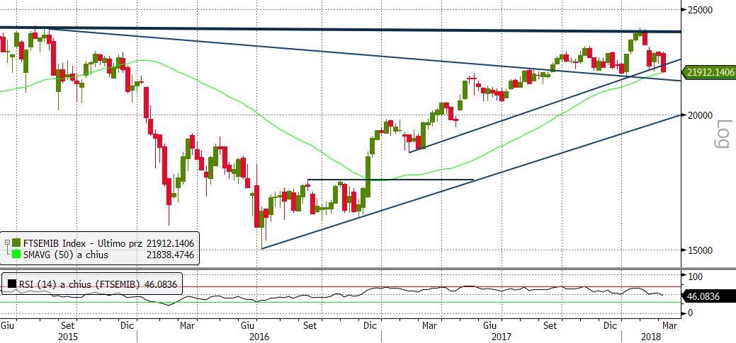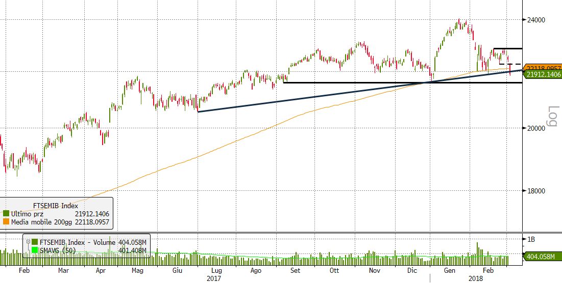Dal punto di vista tecnico il close della candela odierna è molto importante, non solo perché è stato rotto il supporto statico e psicologico a 22.000 punti, ma soprattutto perché ha messo in discussione la tenuta del supporto dinamico di lungo periodo fornito dalla trendline rialzista disegnata sul daily chart unendo i minimi del 30 giugno 2017 e 3 gennaio scorso. Questo movimento ha inoltre corroborato il breakout della media mobile a 200 periodi, avvenuta sempre oggi.