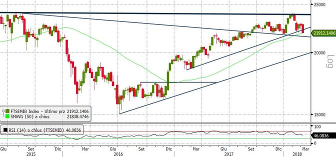 Alle 17:35 si è conclusa l’ultima seduta della settimana di Piazza Affari prima delle elezioni politiche che si svolgeranno domenica 4 marzo. L’indice FTSE Mib ha generato un pericoloso segnale tecnico andando a chiudere a 21.912,143 punti, sotto la soglia psicologica dei 22.000 punti. Quella odierna è stata la peggior chiusura registrata dal 3 gennaio scorso per il mercato tricolore.