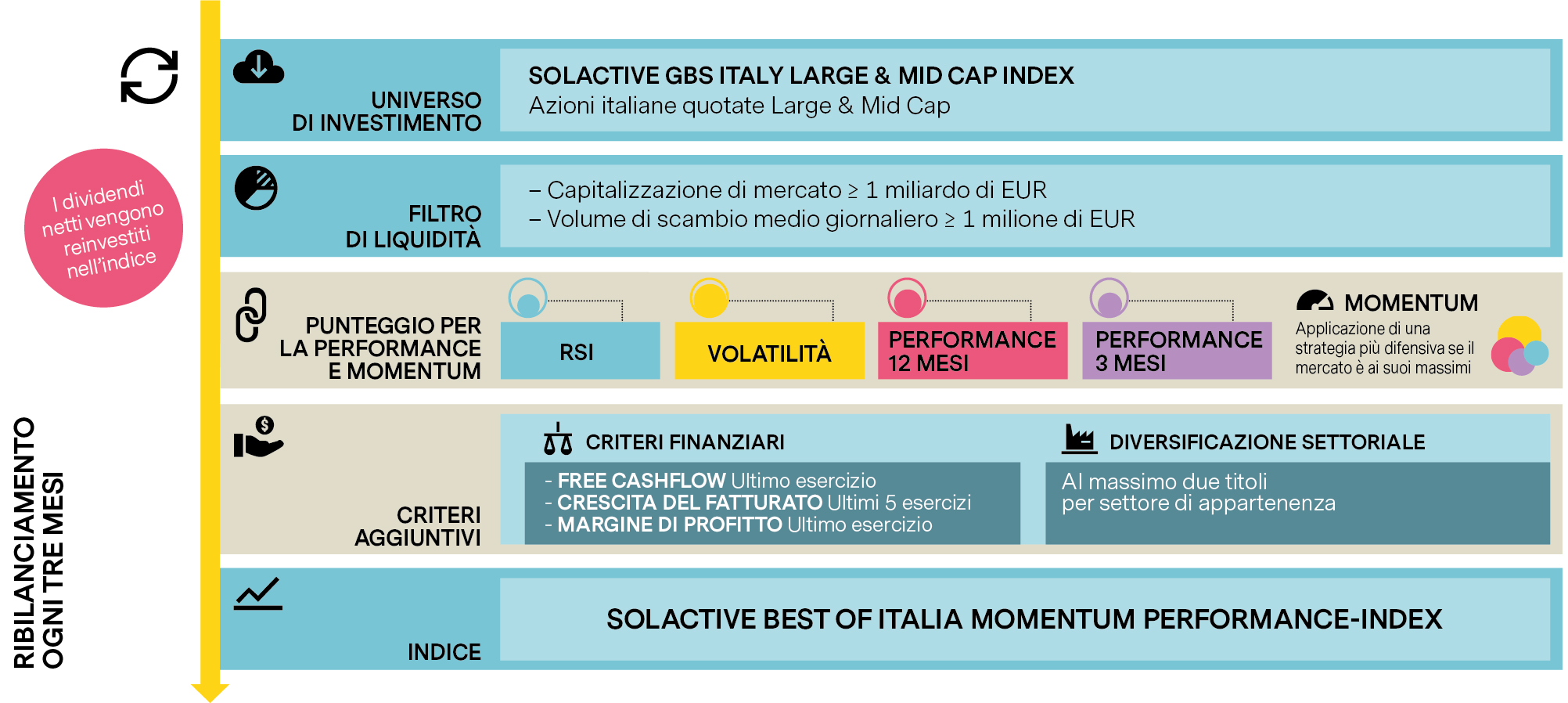 - Forza del trend, misurato con l’andamento dell’oscillatore RSI nelle ultime 3 settimane al fine di escludere dall’indice i titoli sopravalutati dal mercato.