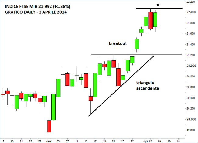 L’indice azionario FTSE MIB è salito dell’1,38% a 21.992 punti, appena sotto i 22.060 punti toccati la sessione del 2 aprile. A questo punto, se dovesse avvenire il breakout decisivo dell’area di resistenza di 22mila punti, l’indice principale della borsa di Milano potrebbe accelerare vistosamente verso il successivo ostacolo tecnico posto a 22.600 punti. La borsa milanese è stata trascinata dai titoli bancari: su tutti spicca il rialzo del 4,23% di Bca Pop Milano, che ha chiuso la seduta a 0,74€. Ben acquistate anche Unicredit (+2,81%), Banco Popolare (+2,3%) e Banca Mps (+2,26%).