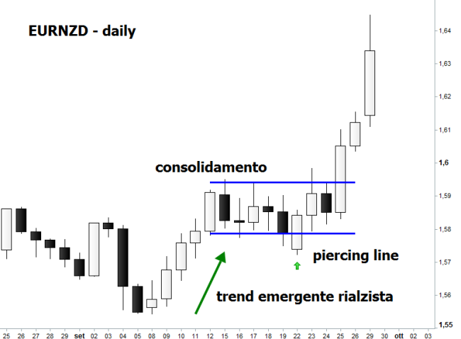 Si può notare un movimento rialzista dei prezzi nel breve periodo, seguito da una fase di consolidamento. A un certo punto avviene un falso breakout ribassista, che confeziona così una classica bear trap (trappola per orsi, ovvero per venditori). Il pattern è molto chiaro: si tratta del piercing line, caratterizzato da un’apertura in gap e da una chiusura superiore alla metà del real body della candela precedente. E’ un segnale long piuttosto affidabile, che in effetti produrrà grossi guadagni nei giorni successivi.