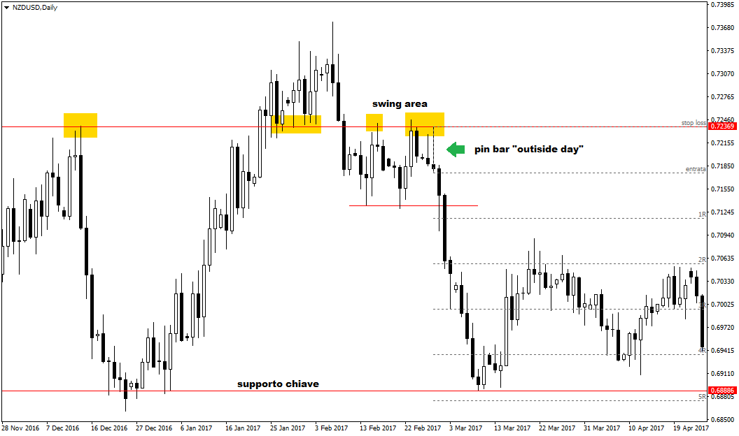 Il grafico giornaliero del tasso di cambio NZD/USD (dollaro neozelandese su dollaro americano) evidenzia una swing area piuttosto netta poco sotto 0,7240. A un certo punto, il breakout ribassista del supporto diventa un possibile momento di inversione. La conferma arriverà di lì a poco, quando sulla stessa swing area – ora diventata una zona di resistenza – viene a configurarsi una pin bar. La stessa candlestick è tra l’altro una candela outside day, ovvero il suo range avvolge completamente il range della candela precedente.