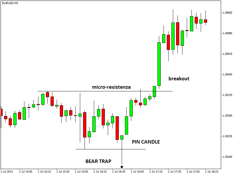 Se osserviamo il grafico del tasso di cambio euro-dollaro, time frame a 5 minuti, possiamo notare la presenza di una pin candle sui minimi di giornata. Il pattern appare dopo il breakout del precedente minimo intraday, per cui contestualmente alla pin candle si forma anche una classica bear trap, ovvero una "trappola per orsi" (venditori). Da questo momento i prezzi inizieranno una robusta ascesa fino al termine della seduta.