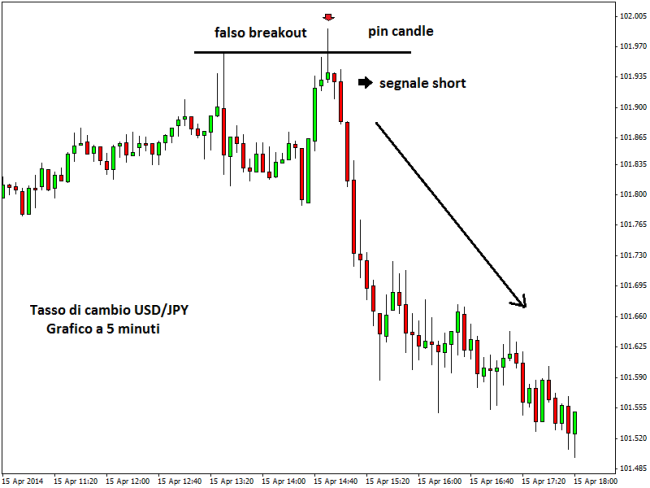 Oggi torniamo ad occuparci dei segnali multipli di trading, perfetti per trovare opportunità di guadagno ad alto potenziale. Grazie ai segnali multipli è possibile cumulare le probabilità a proprio vantaggio, in quanto si utilizzano più segnali operativi che confermano la bontà dell’idea di trading. Il case study di oggi è riferito al tasso di cambio USD/JPY (ovvero dollaro americano su yen giapponese), time frame a 5 minuti, interessato da un’inversione del trend intraday a seguito della formazione di segnali multipli short. La prima indicazione ribassista è la comparsa di una pin candle sui top intraday, che identifica una fase di esaurimento degli acquisti.