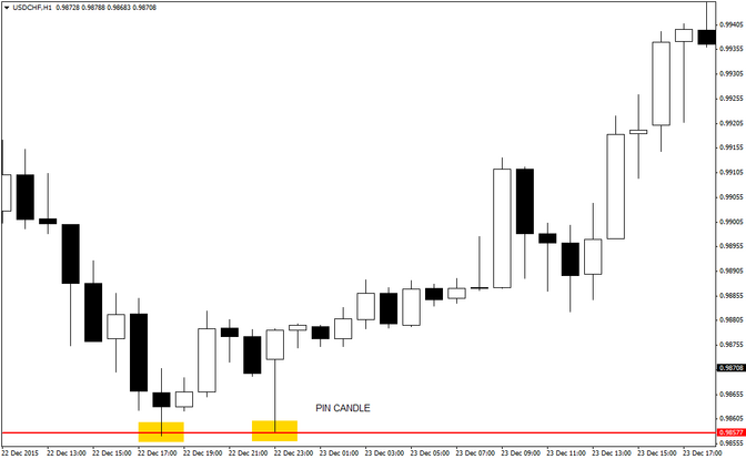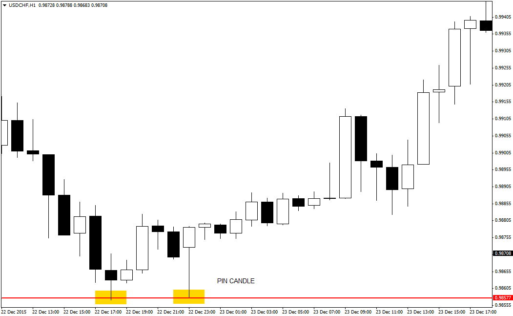 Il grafico intraday mostrato in alto si riferisce al tasso di cambio USD/CHF, ovvero Dollaro americano su Franco svizzero, analizzato su un time frame a 60 minuti. Si può notare che il trend ribassista ha ormai finito le sue ultime cartucce, quando appare una nitida pin candle che va anche a indicare una zona di supporto ben precisa in area 0,9860 – 0,9850 (già toccata qualche ora prima). Il segnale long è netto e potrà essere sfruttato al meglio nelle ore successive.