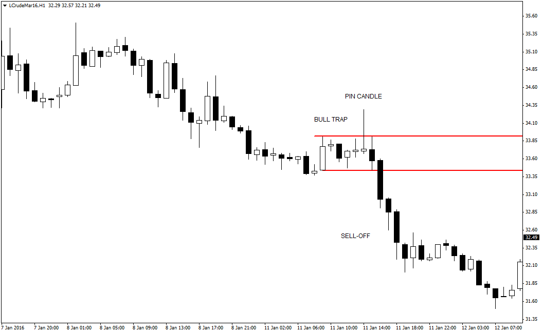 Tuttavia il breakout della congestione non riesce, dando vita a una netta Bull Trap. Il segnale short scatta con la comparsa della pin candle: la lunga coda superiore indica che la pressione esercitata dai compratori non è sufficiente a spingere i prezzi al rialzo, tanto da favorirne un rimbalzo più consistente. Il breakout ribassista della congestione consentirà ai prezzi un forte allungo verso il basso, con un movimento bearish di oltre due dollari per contratto in poche ore.
