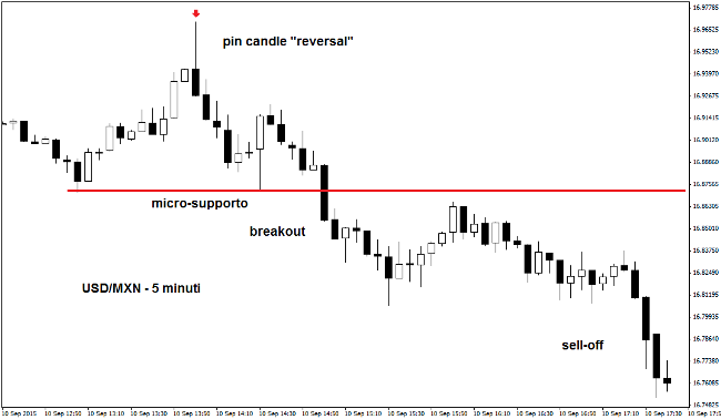 Nell’esempio mostrato in alto sul tasso di cambio USD/MXN, ovvero Dollaro americano su Peso messicano, è possibile notare la formazione di una super pin candle di tipo “reversal” sui top intraday. Il grafico a 5 minuti evidenzia poi un breve movimento bearish fino a un importante micro-supporto, che una volta perforato dà il via a un significativo sell-off intraday.