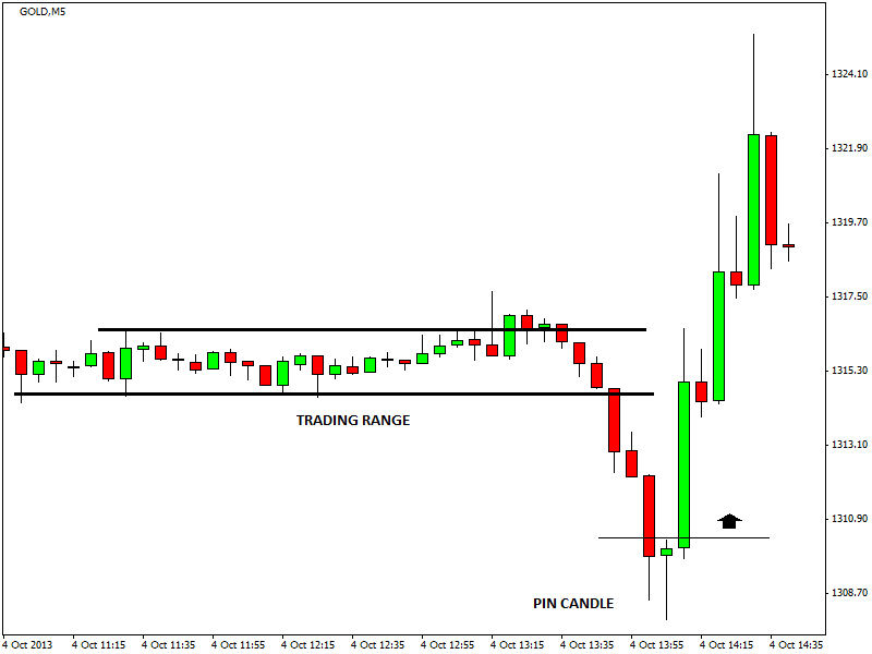 Se si osserva l’esempio grafico sull’oro spot, time frame a 5 minuti, si può notare che il breakout ribassista di una stretta congestione dei prezzi mette in moto la macchina dello short che spinge molti scalper a prendere posizione sul mercato in vista di ulteriori ribassi. All’improvviso si forma una pin candle, che segnala un cambio di direzione del trend del mercato. Gli shortisti devono chiudersi velocemente, mentre sul mercato entrano numerosi buyers per sfruttare la potenziale inversione del trend. I prezzi saliranno con decisione nei minuti successivi, offrendo un’ottima opportunità di scalping.