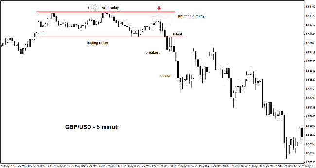 Il grafico mostrato in alto sul tasso di cambio Sterlina/Dollaro (GBP/USD), time frame a 5 minuti, mostra la formazione di una pin candle su una zona di resistenza principale del mercato intraday. La candela pinocchio si forma dopo il falso breakout di una inside candle, per questo può essere chiamata pin “fakey”. Nei minuti immediatamente successivi i prezzi scenderanno con forza, rompendo al ribasso una piccola congestione sui top. Nel giro di qualche ora il Cable perderà 100 pip.