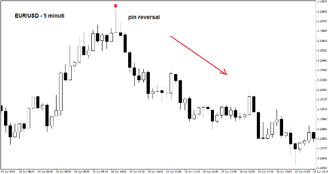 Nel caso mostrato in alto, relativo al tasso di cambio euro/dollaro (EUR/USD), time frame a 5 minuti, è possibile notare una pin reversal con una lunga upper shadow e un corpo inesistente (apertura e chiusura sono corrispondenti). Il pattern di prezzo indentifica un punto di massimo intraday con grande precisione, tanto che nelle pore successive la quotazione scenderà di un centinaio di pip.