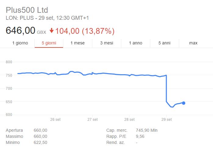 Il prezzo delle azioni di Plus500 è in discesa di circa il 14% nella sessione di giovedì, in calo da 750 a 650 pence.