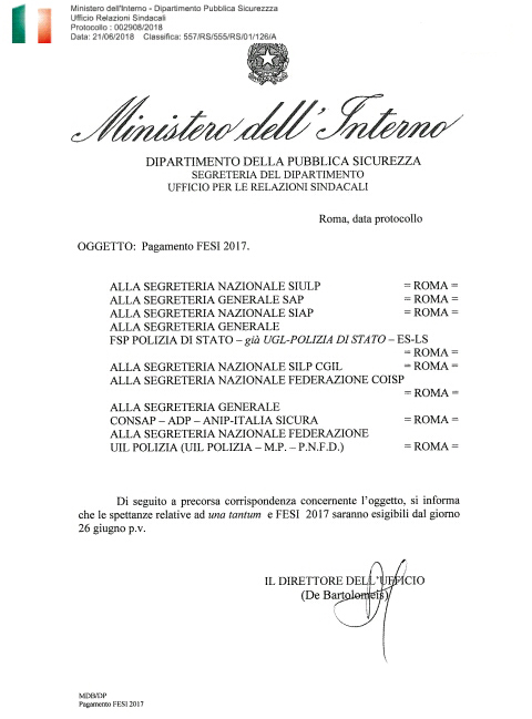 Per fare chiarezza è arrivata la nota pubblicata dal dipartimento della Pubblica Sicurezza del Ministero dell’Interno, con il quale viene confermato il pagamento del FESI e dell’una tantum in un’unica emissione. Nel dettaglio, come si legge nel comunicato in allegato, le spettanze relative al FESI 2017 e all’una tantum saranno esigibili da martedì 26 giugno.