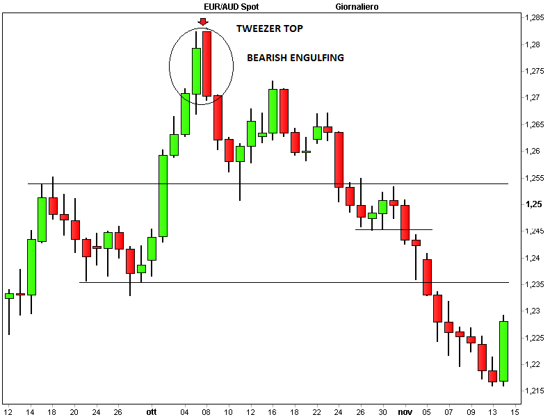 Se si osserva il grafico giornaliero di EUR/AUD si può notare la formazione di un bearish engulfing sui top di periodo. Inoltre, si forma anche un tweezer top, ovvero un doppio massimo "stretto", ovvero lo stesso livello toccato per due sedute consecutive. Il segnale multiplo offre subito una buona opportunità di guadagno nel breve periodo. Poi, dopo un return move fallito, il trend passa da rialzista a ribassista con possibilità di programmare obiettivi di position trading.