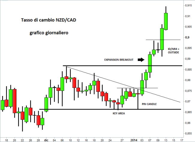 Se si osserva attentamente il grafico daily di NZD/CAD si può notare la formazione di un expansion breakout su base daily e quindi il raggiungimento di un nuovo massimo a 2 mesi con una candela ad ampio range che effettua anche la rottura di una zona di resistenza molto importante. I prezzi salgono velocemente il giorno dopo, poi iniziano un breve consolidamento formando una candela ID/NR4. Il rally prosegue con la realizzazione di una candela outside sui massimi.