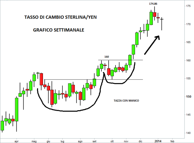 Fare position trading richiede, però, grande attenzione nella lettura dei grafici settimanali o mensili, magari accompagnando l’analisi tecnica ad alcune valutazioni di carattere fondamentale. In ogni caso si possono individuare spesso figure grafiche elementari di analisi tecnica, in grado di evidenziare potenziali opportunità di trading di medio termine. Per capire meglio questo stile di trading proveremo a studiare il grafico weekly del cross sterlina/yen, sul quale ad inizio novembre 2013 si è formata una tazza con manico (accumulazione) davvero molto bella. Il breakout esplosivo di 160 è stato il momento decisivo per assistere al poderoso allungo delle quotazioni, che in meno di due mesi sono aumentate del 9%.
