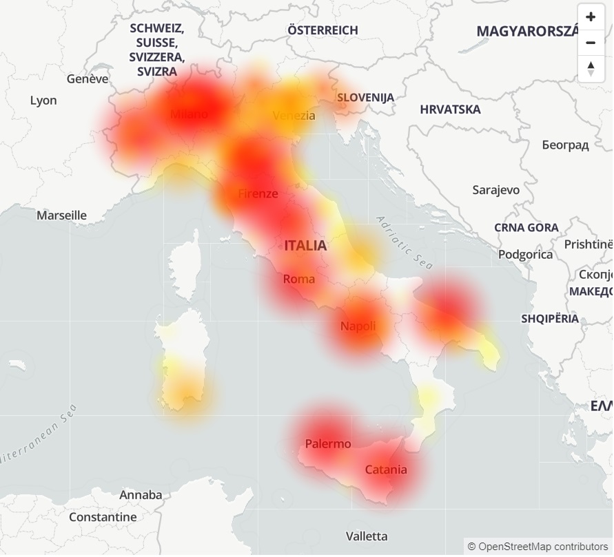 La mappa di downdetector raccogli e disguidi e disservizi in tutta Italia: la situazione illustrata non è delle più rosee (con diverse aree in rosso e arancione a testimoniare la forte incidenza delle segnalazioni fatte):