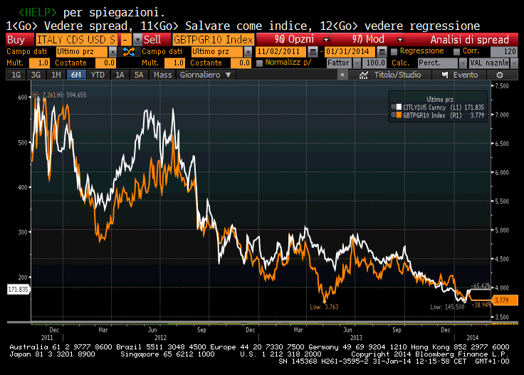 Di nuovo nel mio articolo del 26 dicembre 2013 raccomandavo di continuare a comprare titoli di stato italiani e spagnoli a lungo termine. Il mio target rimaneva il 3.70% per il BTP a 10 anni che allora quotava 102.70 per un rendimento del 4.21%.