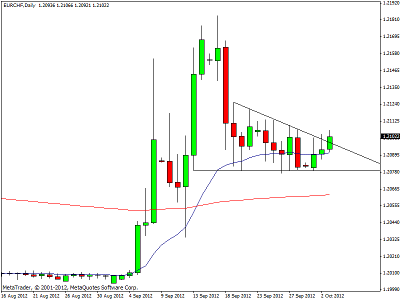 Il tasso di cambio euro/franco svizzero quota oggi a 1,21, ma continua ad essere interessato da una forte congestione dei prezzi. Le quotazioni sono ingabbiate all’interno di un triangolo di compressione della volatilità ormai da un paio di settimane tra 1,2110 e 1,2080.