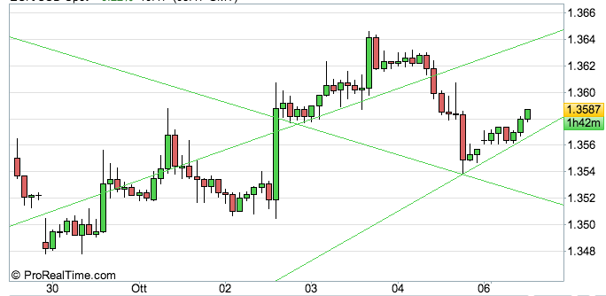 Il cambio Euro/Dollaro ha aperto questa settimana a 1.3564 (con un piccolo gap rispetto alla chiusura a 1.3557 del 4 ottobre). durante la sessione Asiatica il trading è stato piuttosto statico e vediamo una fase di consolidamento attorno all’area 1.3560.
