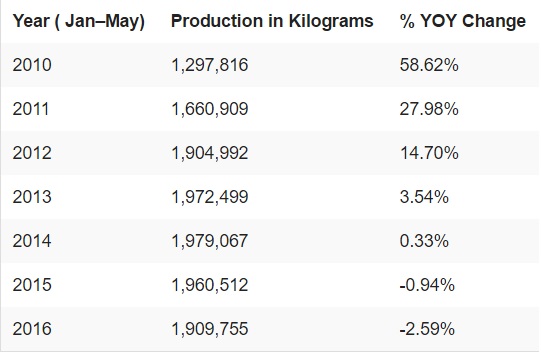 Sulla colonna di destra sono rappresentate le percentuali che indicano gli incrementi di produzione di anno in anno, tenendo a riferimento i mesi da gennaio a maggio. La produzione, ovvero l’offerta, è pressoché ferma da circa quattro anni, con la domanda che invece aumenta e potrebbe presto esplodere.