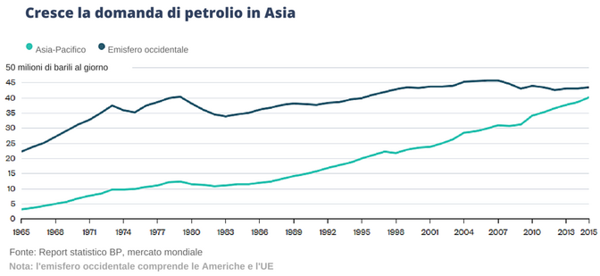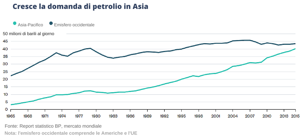 Come mostra il grafico, tutto è nelle mani dell’Asia - almeno quando si tratta di domanda di petrolio. La domanda dal mondo occidentale è ormai piatta dal 2000 ed anche prima la crescita era assai debole.