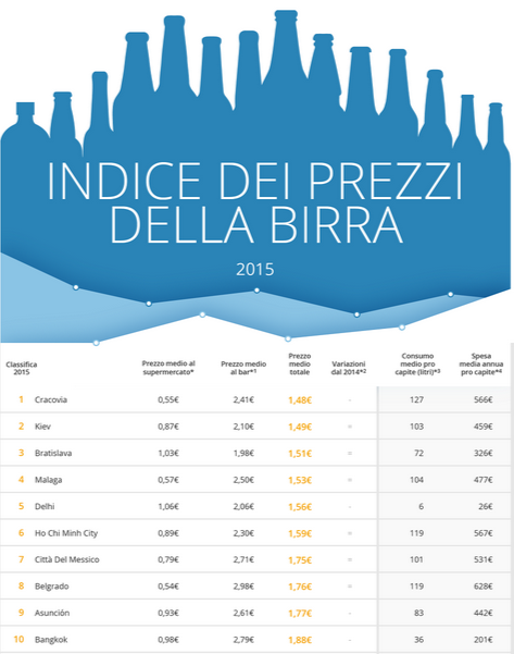 L’indice dei prezzi della birra 2015 prende in considerazione 75 città in 5 continenti e paragona i prezzi della birra delle cinque birre d’importazione più popolari a confronto con le birre locali più comunemente consumate.