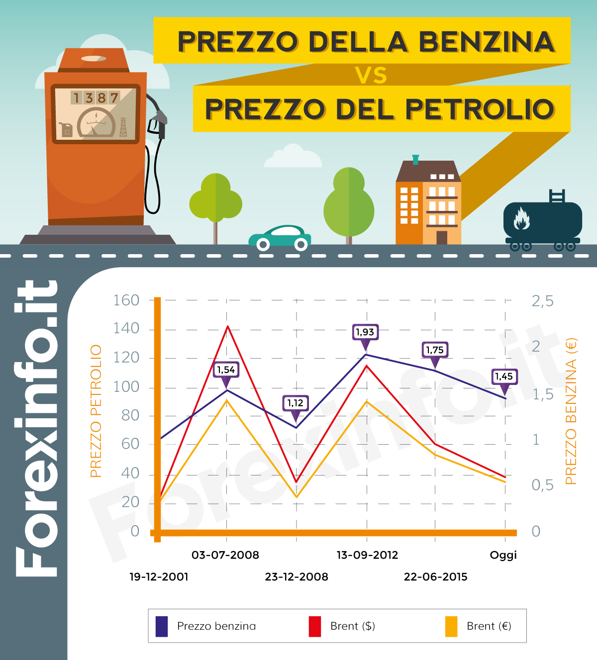 Dall’infografica di Forexinfo.it è semplice notare come l’andamento del prezzo della benzina in Italia abbia un andamento ben diverso dai movimenti dei prezzi del petrolio.