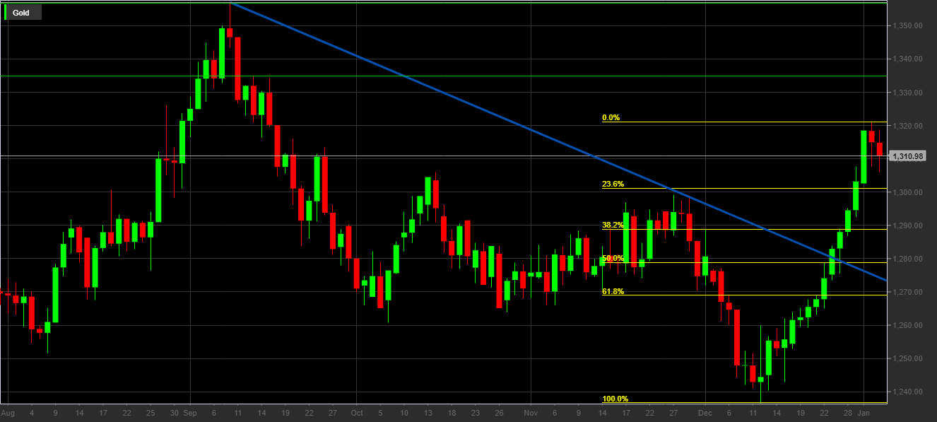 Il prezzo dell’oro ha terminato la sua corsa a quota 1321$ il 3 gennaio dopo un rialzo davvero notevole dallo scorso 12 dicembre, quando la quotazione del metallo era pari a 1236$.