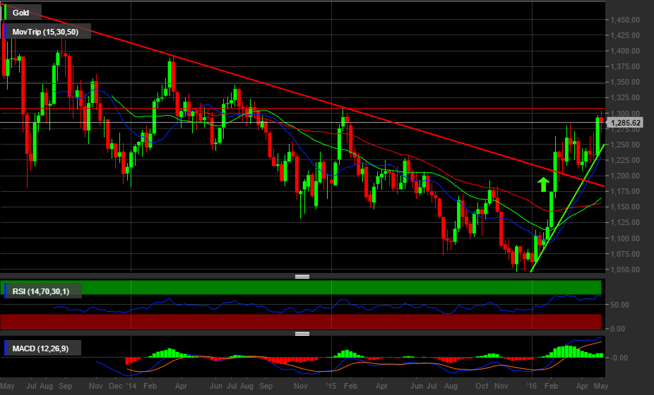 Il lungo trend ribassista, ben rappresentato dalla trendline di colore rosso, è stato interrotto nai primi mesi di quest’anno, con una netta rottura al rialzo della trendline negativa a favore della creazione di una nuova positiva, come è possibile osservare con il seguente grafico che guarda agli ultimi tre anni dell’oro: