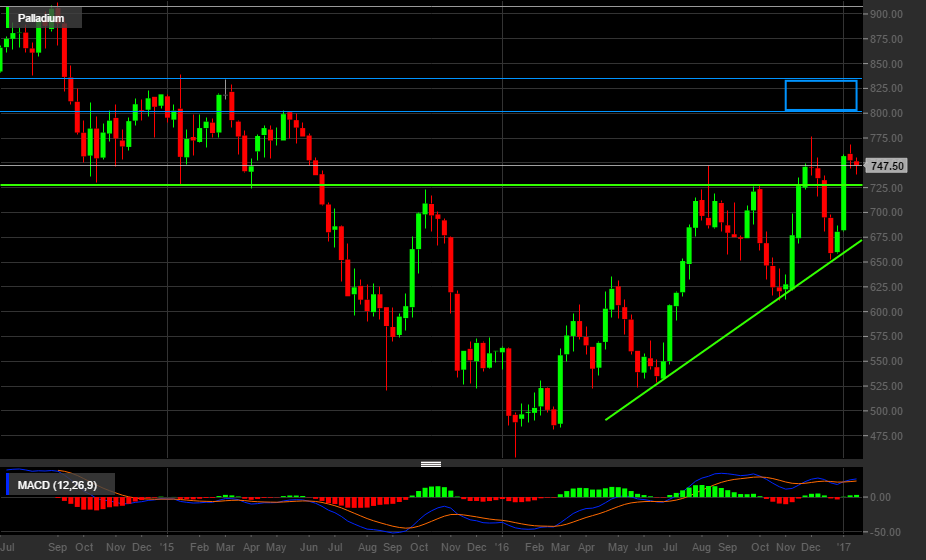 La quotazione del palladio registra un avvio di settimana in leggero ribasso, andamento non rappresentativo del trend nel quale è inserito e dell’inizio del quale è stato protagonista in questo 2017.