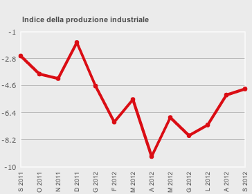 Secondo il bollettino ISTAT, nei primi nove mesi del 2012 la produzione industriale è scesa di 6.5 punti percentuali rispetto allo stesso periodo nel 2011.