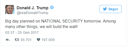 - 25 gennaio 2017 un tweet Trump annuncia la decisione di sbloccare i fondi per la costruzione al confine con il Messico. Anche questa era una promessa più volte ribadita in campagna elettorale e diventata poi uno dei suoi primi provvedimenti.