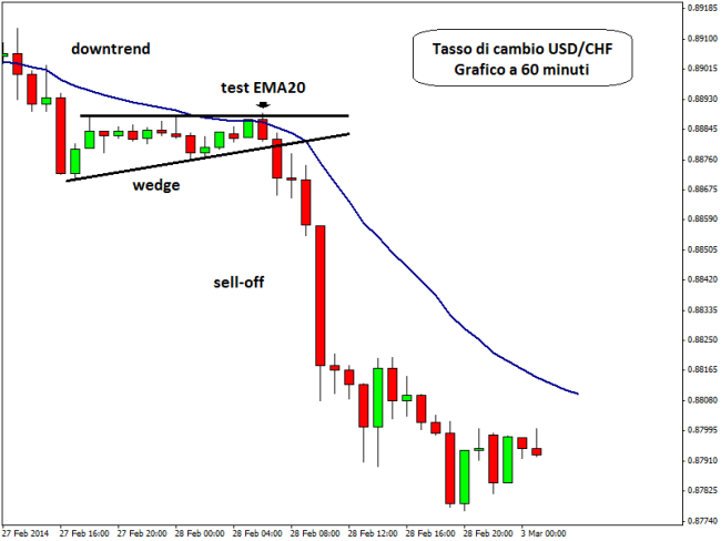 Le strategie sui pullback sono molto utili per cavalcare i trend direzionali, soprattutto se la tendenza principale viene espressa con candele ad ampio range mentre la correzione avviene con candele dal range ridotto. La bassa volatilità aiuta molto a individuare le migliori occasioni di trading sui pullback, come avvenuto sul tasso di cambio USD/CHF, time frame a 60 minuti. Dal grafico intraday dello Swissy mostrato in basso, si può notare un downtrend al quale fa seguito una correzione con bassa volatilità che alla fine porta anche alla formazione di una sorta di wedge, ovvero di cuneo.
