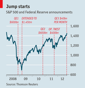 A differenza dei suoi precedenti storici, il QE3 -fa notare il The Economist- è stato lanciato in un momento in cui le borse e i mercati azionari erano in zona positiva.