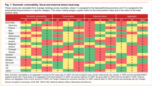 Nella mappa delle minacce di Nomura (fonte: Financial Times) sono catalogati 11 Paesi appartenenti all’eurozona più la Svizzera, i Paesi Scandinavi, Gran Bretagna, USA e Giappone. Ognuno di questi è classificato secondo tre parametri (vulnerabilità domestica, stress fiscale e stress esterno) in un range di rischio compreso tra 1 e 10. I periodi considerati da Nomura sono il 2007, il 2010 e il 2016.