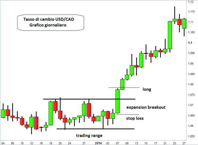 Nel grafico mostrato in alto sul tasso di cambio USD/CAD, ovvero il dollaro americano sul dollaro canadese, time frame giornaliero, è possibile notare un boom delle quotazioni a seguito della formazione di un expansion breakout su base daily dopo una fase laterale. I prezzi, inizialmente ingabbiati in un trading range, mettono il turbo dopo il breakout esplosivo dell’area di resistenza di 1,0730. L’expansion breakout conferma che la rottura è reale, per cui è possibile aprire una long con target a più giorni.