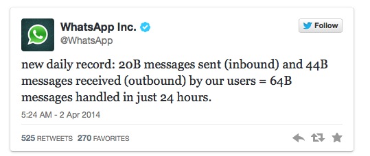 Ma quali sono i numeri che Whatsapp gestisce? Un bacino di oltre 450 milioni di utenti attivi mensilmente, 320 milioni di utenti giornalmente e nuove iscrizioni per un milione nel giro di 24 ore. Di ieri la notizia che sono stati oltre 64 miliardi i messaggi scambiati in un solo giorno sulla piattaforma, cifra che di fatto scalza la precedente che era di circa 50 miliardi (il numero elevato e da capogiro si deve alla diffusione di e al crescere di chat multi gruppo che è possibile gestire con l’app). L’azienda californiana nel giro di un anno ha raddoppiato i suoi numeri (nel 2013 gestiva ogni giorno ventisette miliardi di messaggi).