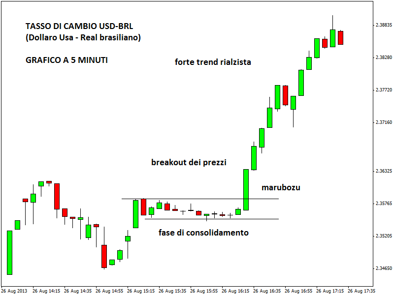 Se si osserva il grafico a 5 minuti del tasso di cambio USD-BRL, ovvero dollaro americano su real brasiliano, si può notare come il breakout di una stretta fase di congestione, accompagnato dalla marubozu candle, abbia favorito l’inizio di un solido movimento direzionale rialzista dei prezzi: una buona opportunità per intervenire long sul cambio, per sfruttare il rialzo delle quotazioni.