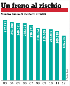 Gli italiani usano meno l’auto per risparmiare e questo ha diverse conseguenze positive: dalla riduzione dell’inquinamento a quella degli incidenti. Secondo i dati Istat infatti nel 2012 gli incidenti stradali in Italia sono diminuiti del 9,2% rispetto al 2011 (i feriti del 9,3% e i morti del 5,4%).