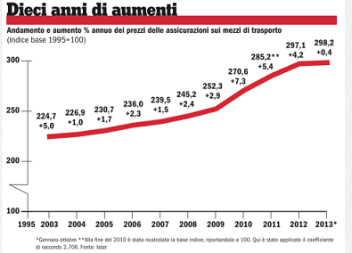 "In Italia la Rc Auto si mangia il 6,5% dello stipendio, il doppio della media Ocse e il triplo dell’Inghilterra. Prima della liberalizzazione tariffaria del 1994, sotto il regime dei prezzi amministrati, gli assicurati pagavano in media 700.000 lire, il controvalore di 361 euro per assicurare un’auto di media cilindrata fino a 1.800 Cc. Dodici anni dopo, nel 2006, il costo medio della stessa polizza per un auto di fascia media, non contando le punte estreme come la Campania, è lievitato a 868 euro, con un rincaro del 140,5 per cento, per passare a 1.250 euro nel 2012, con un aumento a 889 euro secchi (+190%) stimati nel 2013, a differenza di altri Paesi Ue, come Francia, Spagna e Germania, dove gli aumenti registrati negli stessi anni, non hanno mai superato la soglia dell’87%".