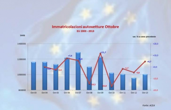 Secondo questi dati ACEA, ad ottobre 2013 sono state immatricolate nei 27 Paesi dell’UE e nei 3 dell’Efta 1.044.921 autovetture, in crescita del 4,6%. A chiusura dei 10 mesi dell’anno la flessione si ridimensiona ad un -3,1% con 10.385.061 unità.