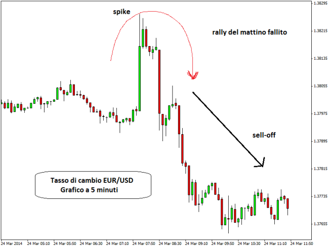 Se osserviamo il grafico in alto del cambio euro/dollaro, time frame a 5 minuti, possiamo notare una forte accelerazione bullish dei prezzi che però si conclude velocemente con uno spike. Dopo un breve consolidamento di 20-25 minuti i prezzi crollano, generando un brusco movimento di inversione del trend intraday. Il rally mattutino fallito avviene in genere tra le ore 8 e le 10, ovvero quando ci sono i primi scambi in Europa. Non serve molto tempo per completare il pattern (di solito entro i 60 minuti). E’ un pattern utile per fare scalping intraday sul forex.