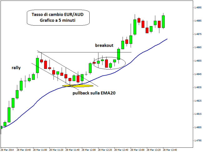 Nel grafico mostrato in alto, relativo al tasso di cambio EUR/AUD (euro su dollaro australiano), time frame a 5 minuti, si può notare la presenza di un rally che spinge con decisione le quotazioni verso l’alto. Si tratta di una serie di long candle di colore verde consecutive, che indicano chiaramente una tendenza rialzista di brevissimo periodo. Successivamente avviene un ritracciamento con bassa volatilità, che trova supporto sulla EMA20. Qui il day trader può entrare long, sfruttando l’ottimo rapporto rischio/rendimento che in genere offre questa tipologia di transazione.